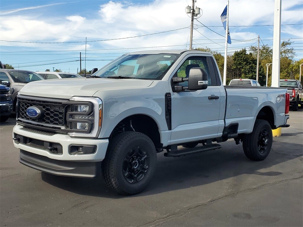 This Vehicles features Ford Connectivity Package (1-Year Included), GVWR: 10,000 lb Payload Package, Internet access capable: 5G Modem - Ford Connectivity Package, Snow Plow Prep Package, 4WD, 250 Amp Alternator (Gas), 3.73 Axle Ratio, 4 Speakers, 4-Wheel Disc Brakes, ABS brakes, Air Conditioning, AM/FM radio, AM/FM Stereo w/MP3 Player, Brake assist, Cloth 40/20/40 Split Bench Seat, Compass, Delay-off headlights, Dual front impact airbags, Dual front side impact airbags, Electronic Stability Control, Emergency communication system: SYNC 4 911 Assist, Exterior Parking Camera Rear, Front & Rear Wheel Well Liners (Pre-Installed), Front anti-roll bar, Front Center Armrest w/Storage, Front reading lights, Fully automatic headlights, Heated door mirrors, Illuminated entry, Low tire pressure warning, Outside temperature display, Overhead airbag, Overhead console, Panic alarm, Passenger cancellable airbag, Passenger vanity mirror, Platform Running Boards, Power door mirrors, Power steering, Power windows, Rear step bumper, Remote keyless entry, Remote Start System, Security system, Speed control, Steering wheel mounted audio controls, SYNC 4, Tachometer, Tailgate Step & Handle, Telescoping steering wheel, Tilt steering wheel, Traction control, Trip computer, Turn signal indicator mirrors, Upfitter Switches (6), and Variably intermittent wipers.