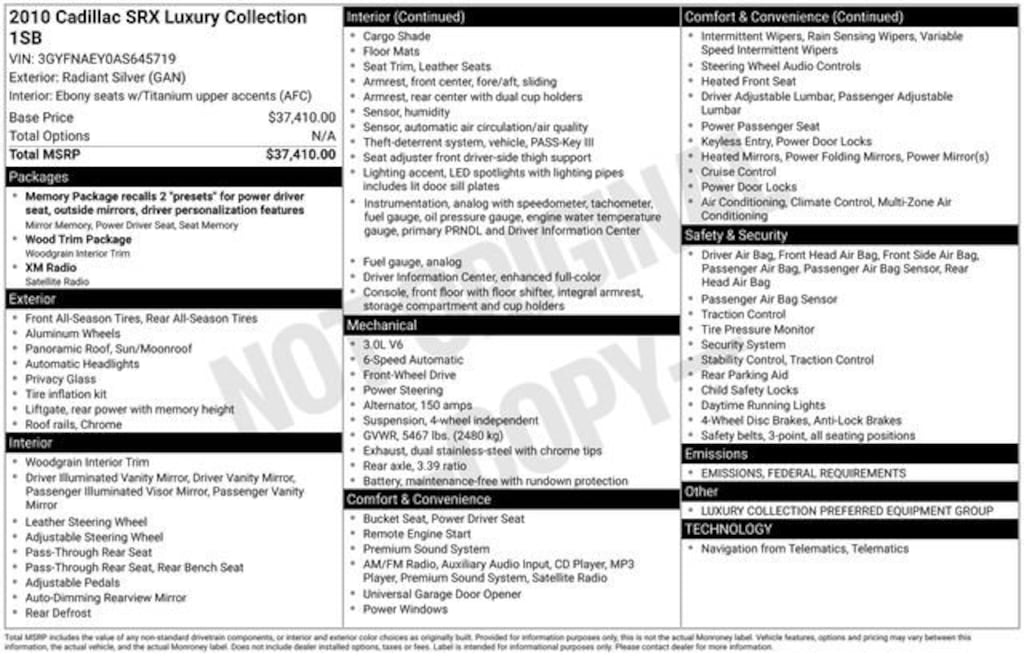 Radiant Silver 2010 Cadillac SRX Luxury FWD 6-Speed Automatic 3.0L V6 SIDI DOHC VVT
