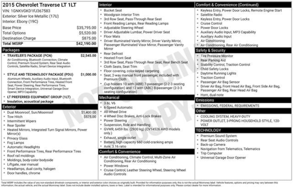 Recent Arrival!Silver Ice Metallic 2015 Chevrolet Traverse LT 1LT AWD 6-Speed Automatic 3.6L V6 SIDIAWD.Awards:* JD Power Initial Quality Study, JD Power Dependability Study * JD Power Initial Quality Study * 2015 KBB.com 10 Best Certified Pre-Owned 3-Row SUVs Under $30,000 * 2015 KBB.com Best Buy Awards FinalistOur dealership is family owned and operated and has been serving Oakland County and its surrounding communities since 1954. Lunghamer Buick GMC is focused on excellent customer service. We will find the right vehicle for your life style, the right financing to fit your budget, and a total ownership experience second to none. We are here to service you. Joe Knows that service repairs never fit into your busy schedule. That's why we offer convenient service hours Monday through Friday, 8am-5pm. We feature highly trained service advisors and factory trained technicians, we feature state of the art equipment, and we realize that repairing your vehicle right the first time at a fair price will keep you coming back for years to come. We invite you to come down and take a stroll through our large inventory of new and used vehicles, talk to our sales and service advisors, have a free coffee, tea, or water and make Lunghamer Buick GMC your sales and servicing dealer. Call us today at 248-461-1000 and let us know how we can help!JOE KNOWS USED CARS! * CPO APR AVAILABLE ON SELECT MODELS FOR WELL QUALIFIED BUYERS.Reviews:* If you want a big, 3-row midsize SUV that starts under $32,000, holds up to eight passengers, and has a standard V6 and that returns decent fuel economy, the 2015 Chevy Traverse remains a tempting family hauler. Source: KBB.com* Compliant ride quality; generous cargo capacity, even behind the third row; seating for up to eight passengers; top crash test scores. Source: Edmunds