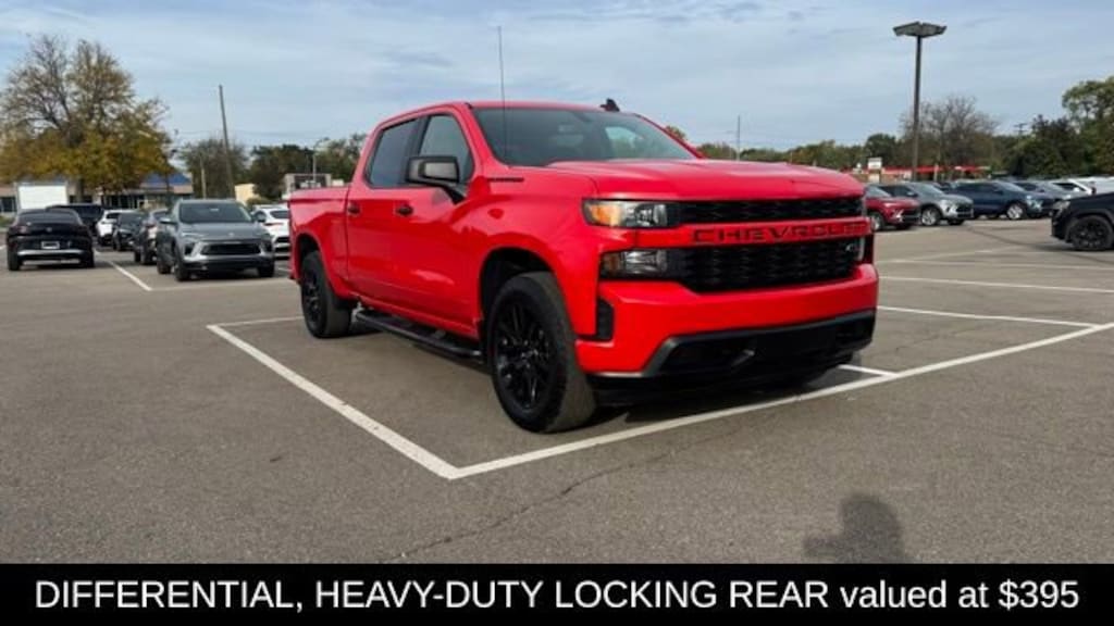 GOOD BRAKES, Silverado 1500 Custom, 4D Crew Cab, 2.7L Turbo, 8-Speed Automatic, 4WD, Red Hot, Jet Black w/Cloth Seat Trim, 120-Volt Bed Mounted Power Outlet, 120-Volt Instrument Panel Power Outlet, 170 Amps Alternator, 3.42 Rear Axle Ratio, 3.5 Diagonal Monochromatic Display, 40/20/40 Front Split Bench Seat, 6 Speakers, Air Conditioning, Alloy wheels, Black Name Plates (LPO), Black Tailgate CHEVROLET Lettering (LPO), Bluetooth® For Phone, Body Color Grille, Brake assist, Color-Keyed Carpeting Floor Covering, Custom Convenience Package, Custom Value Package, Dark Essentials Package (LPO), Deep-Tinted Glass, Delay-off headlights, Electric Rear-Window Defogger, Electronic Stability Control, Exterior Parking Camera Rear, EZ Lift Power Lock & Release Tailgate, Front 40/20/40 Split-Bench Seat, Front Black Bowtie Emblem (LPO), Front Center Armrest, Front Frame-Mounted Black Recovery Hooks, Front Rubberized Vinyl Floor Mats, Fully automatic headlights, Heated door mirrors, Heavy Duty Suspension, Heavy-Duty Rear Locking Differential, Hitch Guidance, Infotainment Package, LED Cargo Area Lighting, Locking Tailgate, Manual Tilt-Wheel Steering Column, Panic alarm, Passenger door bin, Polished Exhaust Tip, Power Door Locks, Power door mirrors, Power Front Windows w/Driver Express Up/Down, Power Front Windows w/Passenger Express Down, Power Rear Windows w/Express Down, Preferred Equipment Group 1CX, Radio data system, Radio: Chevrolet Infotainment 3 System, Rear 60/40 Folding Bench Seat (Folds Up), Rear Rubberized-Vinyl Floor Mats, Rear step bumper, Remote Keyless Entry, Remote Vehicle Starter System, Single-Zone Manual/Semi-Automatic Air Conditioning, SiriusXM Radio, Speed control, Speed-sensing steering, Split folding rear seat, Steering Wheel Mounted Electronic Cruise Control, Theft Deterrent System (Unauthorized Entry), Traction control, Trailering Package, Variably intermittent wipers, Wheel Locks (Set of 4) (LPO), Wheels: 20 x 9 Bright Silver Painted Aluminum.