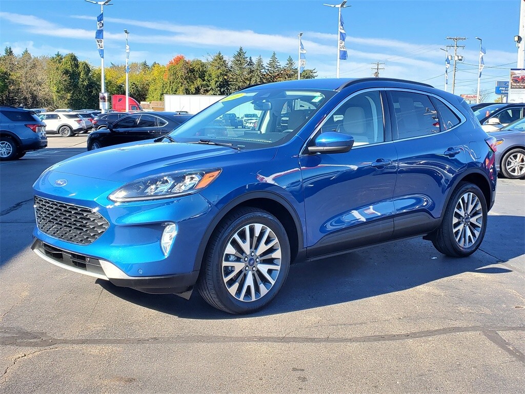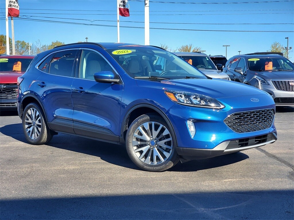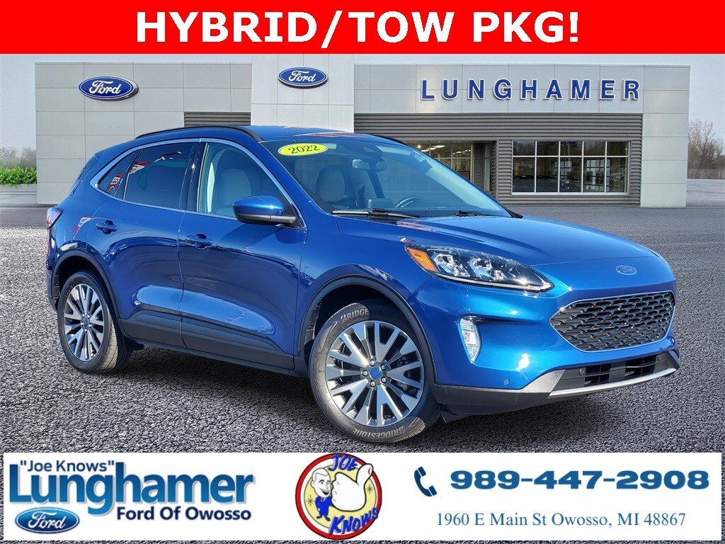 Atlas Blue Metallic 2022 Ford Escape Titanium Hybrid AWD eCVT 2.5L iVCT 2022 Ford Escape, *ONE OWNER*, *LOCAL TRADE*, Escape Titanium Hybrid, 4D Sport Utility, 2.5L iVCT, eCVT, AWD, Atlas Blue Metallic, Sandstone w/Heated ActiveX Trimmed Front Sport Contour Bucket Seats, Class II Trailer Tow Package, Electronic Fuel Door Release, Equipment Group 400A, Neutral Towing Capability, Pedestrian Alert Sounder, Wheels: 19" Machined-Face Aluminum.
