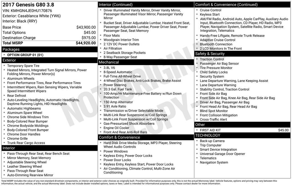 Elevate your driving experience with this meticulously maintained 2017 Genesis G80 3.8. Boasting a powerful 3.8L V6 engine, this all-wheel-drive sedan delivers an exhilarating blend of performance and efficiency, with an EPA-estimated 16 city/25 highway MPG.- FIRST AID KIT- Option Group 01- Radio: AM/FM/SiriusXM/HD/CD/MP3 Audio System- Memory seat- Remote keyless entry- Android Auto & Apple CarPlayIndulge in the refined comfort of the G80, featuring a suite of premium amenities that elevate every journey. Enjoy the convenience of dual-zone climate control, a rearview camera, and a state-of-the-art infotainment system with seamless smartphone integration. The leather-wrapped steering wheel and power-adjustable front seats with memory settings ensure a personalized driving experience.Safety is paramount in the G80, with a comprehensive suite of advanced driver-assistance technologies. Benefit from features like automatic emergency braking, lane departure warning, and a robust airbag system to give you and your loved ones peace of mind on the road.Elevate your daily commute and weekend adventures with the exceptional performance and refined elegance of this 2017 Genesis G80 3.8. Schedule a test drive today and experience the difference for yourself. We're confident this sedan will exceed your expectations and become the perfect addition to your lifestyle.
