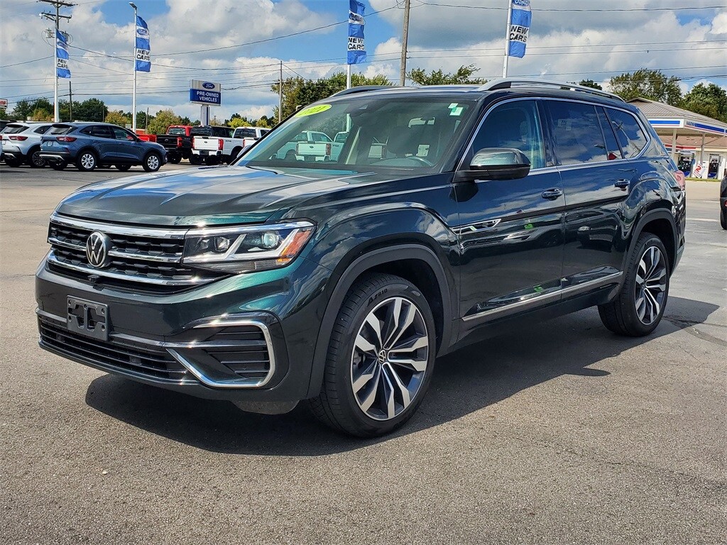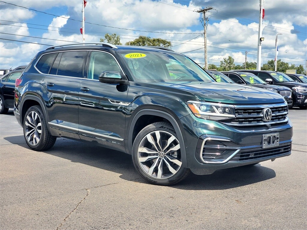 Racing Green Metallic 2021 Volkswagen Atlas 3.6L V6 SEL Premium R-Line AWD 8-Speed Automatic with Tiptronic 3.6L VR6 2021 Volkswagen Atlas, *AWD*, Atlas 3.6L V6 SEL Premium R-Line, 4D Sport Utility, 3.6L VR6, 8-Speed Automatic with Tiptronic, AWD, Racing Green Metallic, Titan Black w/Quartzite w/Perforated Vienna Leather Seating Surfaces, 12 Speakers, 3rd row seats: split-bench, Air Conditioning, Auto High-beam Headlights, Automatic temperature control, Front dual zone A/C, Front fog lights, Fully automatic headlights, Heated rear seats, Heated steering wheel, Htd/Actively Ventilated Comfort Front Sport Seats, Memory seat, Navigation System, Perforated Vienna Leather Seating Surfaces, Power driver seat, Power Liftgate, Power moonroof, Power passenger seat, Power windows, Radio data system, Rear air conditioning, Rear audio controls, Rear window defroster, Speed control, Tilt steering wheel, Wheels: 21" 2-Tone Machined Alloy.